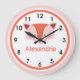 Personalise this acrylic wall clock printed with a cute fox face for a child with his or her name. Created in soft pink, orange and white colours with a circle border accent so cute for nursery or toddler's room.. Nice baby shower or toddler gift. Your choice of medium or large size.