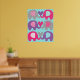 Elephant Love nursery poster features six elephants in grey, pink, and purple with patterned ears ears on a teal blue polka dotted background!