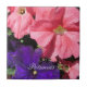 Pretty pink and purple petunias in full bloom on a sunny day .
