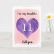 A personalized pink and purple 11th birthday daughter card that features a watercolor heart against a pink watercolor. You can personalize the watercolor heart with the age you need and add her name underneath the heart. The inside card message reads a birthday message, which can also be personalized if wanted. The back of the card has the watercolor heart and a happy birthday message. This would make a unique birthday keepsake for her.