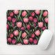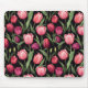 This mousepad features vibrant pink and red tulip flowers that stand out against the dark contrasting background and the lush green leaves. This bold floral pattern exudes elegance and sophistication and is perfect for anyone who loves vibrant yet refined designs. The black background creates a stark contrast against the bright pink and red tulips which enhances the vivid colours of the tulips, making the design stand out in the stunning, eye-catching pattern. Tulips are often associated with love and passion and are admired for their simplicity and elegance. In different colours, they carry various meanings: red tulips can represent deep love, while pink tulips can signify happiness and affection.