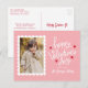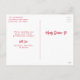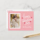 Cute Valentine's Day photo postcard featuring your vertical photo inside of a white postage stamp frame. The phrase "Happy Valentine's Day" is displayed in whimsical, white hand-lettering surrounded by red hearts. Personalise the front of the photo Valentine's Day postcard with your family name in white lettering on a pink background. The postcard reverses to display your return address and personal message in red lettering.
