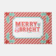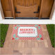 This door mat features a cheerful holiday greeting in a modern victorian style typography on a pink and red striped background.