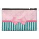 Teal and white stripes combine with a pink brocade/damask pattern on this great accessory bag. A pink and white polka dot bow and a horizontal stripe of hot pink are finishing touches.