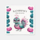 A vibrant and whimsical bird with a combination of fluffy turquoise and pink feathers. It possesses large, expressive eyes adorned with shimmering jewels in shades of pink and turquoise. The bird's head is decorated with a crown-like structure made of pink flowers and jewels. The tail feathers are a striking shade of turquoise with teal gem-like patterns. The bird stands upright, with its feet positioned on the ground, and its wings slightly tucked behind.