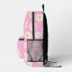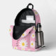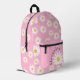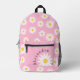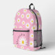 This cute and colourful pink backpack is sure to bring a smile with an all over pattern of white daisies, which are a very happy flower. Personalise it with a name in script typography in a dark grey colour to match the zippers. Front pocket features the name and one large daisy. Perfect for school, the gym, travel and every day errands. This is a prefect back to school gift for a girl.