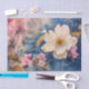 A pretty design of a large white flower and small pink flowers over a blue background.