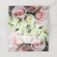 Elegant folded place card with a photograph of pink and white roses as the background. The inside of the place card is done in pale pink. A semi transparent white rectangular text area, on the front of the card is ready to personalise by hand, for your wedding reception.