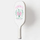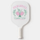 This pickleball paddle has a pink and green line art image of pickleball paddles and a martini glass surrounded by laurel branches with the phrase "Pickleball Cocktail Club, Please Dink Responsibly." Colours used include green and pink. The back has pink and white stripes that coordinate with the design on the front.