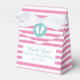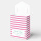 Pink and white stripes baby shower party favour box. Custom thank you for coming message. Cute lines print with elegant script typography and adorable baby footprints Customisable background colour. Baby feet design for babyshower party celebration. Girly Turquoise blue and pink colours for new baby girl / newborn child. Tent shape favour boxes. Trendy babyshower ideas.