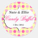 Pink and yellow dotty Candy Buffet Sticker. Great for Candy buffets or cupcake tables at weddings, birthday parties, Baby showers, Communion, Confirmations and lots more! Design features background with pink polka dot print on lemon yellow background. A curly bracket tag in white features your chosen text!