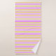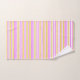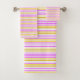 Stripes in pink yellow and white bath towel set. The white towel background colour can be changed to suit your style. Beautiful gift idea, personalise with a name. The stripe print image is also removable.