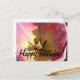 Birthday card, model "Pink and yellow tulip". Macro photo of a pink tulip with a yellow heart, and the text "Happy birthday!"