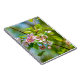 Closeup view of pink apple flowers and green leaves. The height of spring season, fruit trees in full bloom. Textured photography, joyful colours.