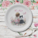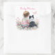 Girl's pink and sage green baby and puppy dog it's a girl sticker. Sweet baby girl sitting next to her little black and white Mini Aussie puppy dog in a patch of pretty watercolor flowers. Pink and sage green butterfly and pretty wildflowers.