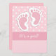 This invitation features a design with two pink baby footprints on a varied pink and white polka dotted background. The bold pink stripe features customisable "It's a girl" text. The pink background on the back, and the text, can be customised as desired.
