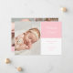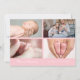 Pink photo collage baby girl birth announcement card to introduce your beautiful baby daughter. The front includes a baby photo with white script typography for your little one's name with pink modern text for the birth stats. The reverse has four further baby photos and includes a white script message with the parents name(s) set on a pink background. Designed by Thisisnotme©