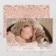 Your new baby girl is ready to meet the world. Introduce her to your family and friends with our Pink Baby Girl Photo Birth Announcement. This birth announcement features soft, sparkly blush pink rose gold glitter touches on the front and sparkly blush pink rose gold glitter waves with her name in a beautiful and elegant script typography. Personalise this birth announcement with all her birth stats to make it her own.