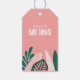 Tropical baby shower favour tag with tropical leaves in shades of pink and green and wood grain reverse side.