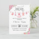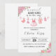 This baby shower invitation features a charming pink theme with baby girl clothes, like a dress, and shoes, hanging on a clothesline. The corners are adorned with delicate floral arrangements in pink and green, adding a soft, elegant touch to the design, perfect for welcoming a baby girl.