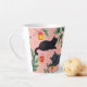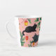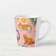 This latte mug has a pink type of background. It has a few cats with other items. Just right for cat lovers.