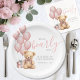 A cute and girly pink bow baby shower paper party plate featuring an adorable baby pink watercolor teddy bear holding balloons on the left side. In the top right area, “We Can Bearly Wait” is written in soft pink script calligraphy. Below, the mother’s name and baby shower date are displayed in a mix of soft gray serif and script fonts.
