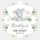 Cute girl's watercolor elephant baby shower sticker featuring a cute watercolor elephant, a pink heart shaped balloon and some eucalyptus foliage. This sticker or label is ideal for a girl's elephant themed baby shower.