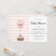 Girls baby shower invitation card with a pretty pink balloon featuring the words 'baby girl' in black and white hold by a cute pink bunny in a basket. Pastel pink stripes pattern on the back of the card. These adorable baby shower invitations are easily customised for your event by simply adding your personal details.
