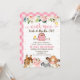 Cute farm themed birthday invitation featuring a horse, pig,cow and sheep as well as floral arrangement and pink barn. This invitation design is a cute way to set the scene for a farm themed girl's birthday party.