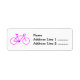 This design features a pink bicycle silhouette on a white background, with personalised name and address details.