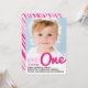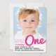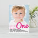 This baby girl's 1st birthday invitation card features a modern and bold typographic sketch 'one' title script in fuchsia hot pink colour overlaying a full bleed photo with a matching white scribbles backer.