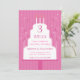 A pink invitation with balloons and a white cake with lit candles. The text shows inside the space of the cake for a fun and informative invite. The background on the front of the card has a pink stripe pattern.