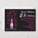 Fun festive 21st birthday party invitation done in black, with two tones of pink text. Fun graphics of a pink champagne bottle, with shooting stars and streamers surrounding it, decorates the left side of the invitation. Text is ready to personalise for your big day. Customise to add text to the back of the card.