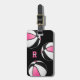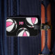 This basketball themed luggage bag tag is simply designed with three randomly arranged basketballs that have alternating pink, white and black panels on a customisable black background - personalise with player name and monogram on the front, address information on the back - by katz_d_zynes