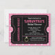Bridal Shower Ticket Invitations, in pink and black with cute hot pink background and a gold and diamond wedding ring icon. Great to customise with your party info. Makes a fresh, unique invite for the bride to be! Styled to resemble a real admission ticket with faux cutouts and faux perforated sides, this bold and fun invite is great for a girls event with fun and excitement.
