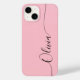 Pink Black Elegant Calligraphy Script Custom Personalised Name iPhone 14 Smart Phone Cases features a modern and trendy simple and stylish design with your personalised name in elegant hand written calligraphy script typography on a soft pink background. Designed by ©Evco Studio www.zazzle.com/store/evcostudio