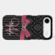 This monogrammed black and grey damask Samsung Galaxy Case-Mate Case has a photo of this design embedded into the hard plastic cover. The design is made up of a black and grey floral damask pattern, a printed pink bow and ribbon, two hearts with diamonds and a black and grey striped pattern bottom portion where you can add your name and monogram initial in gorgeous script fonts. This Samsung case cover is the perfect way to accessorise your phone. Be stylish and girly all at the same time. Design by Elke Clarke©2012. Graphics licensed for use.