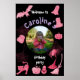 Pink and black Birthday party welcome poster with illustrated Halloween motifs. In the centre you can customise the poster with your baby's favourite and you can modify all the text that comes out. On the back a print with funny ghosts flying.
