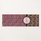 Yoga mat features pink and black leopard spot print. The top section is black with a gold and pink fern pattern. In between the sections is a pink circle, lined in black that you put your name and initial in. A chic, elegant yoga mat to bring to your yoga class!
