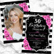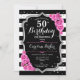 Elegant floral feminine 50th birthday invitation with your photo at the back of the card. Glam black white pink design with faux glitter silver. Features black and white stripes, pink roses, script font and confetti. Perfect for a stylish adult bday celebration party. Personalise with your own details. Can be customised for any age! Printed Zazzle invitations or instant download digital printable template.