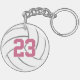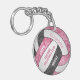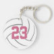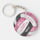 This custom team colours volleyball keychain features the realistic image of a volleyball that has a floral kaleidoscopic pattern blended with its pink and black panels - her name, court position, team name and school / club year are customisable on the front, as is her jersey number on the back overlying a simple volleyball seams graphic - by katz_d_zynes