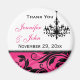 This modern and trendy fuchsia pink, black and white chandelier wedding favour thank you magnet has an ornate pink and black swirls and scrolls border on it that matches the wedding invitation shown below. You can also customise it to say "Save the Date" and use it to announce your upcoming nuptials to your family and friends. If there are any other matching items you require, please email your request to niteowlstudio@gmail.com.