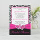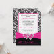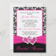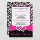 This dern chic black and white damask bridal shower invitation has a hot pink PRINTED ribbon with a pair of FAUX (PRINTED) glitter joined diand hearts brooch on it. All text and the type of paper is customisable. ***PLEASE NOTE that there are no raised elements on this design. Everything is printed flat. ***PLEASE NOTE that if you change the font or size of the font, it may alter how your invitation prints. It will print the way you see it on your nitor, so if you have alignment issues, or sizing problems, please contact me for help. I will not see your invitation once you order it, and Zazzle will NOT edit anything (typos, alignment, etc.). If you require assistance or would like any other matching items, please email your request to niteowlstudio@gmail.com.