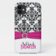 Personalised modern hot pink, black, and white damask Case-Mate Barely There™ iPhone 5 Case with PRINTED ribbon and jewel brooch.