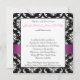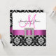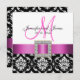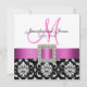 Elegant black and white damask wedding invitations with a photo print of a pink satin ribbon, square brooch with photo print of white diamonds. Elke Clarke©2012. Graphics licensed. Ribbon and jewels are not real, even though the graphics make them look quite realistic. These gorgeous wedding invitations are personalised with your bride and groom names and wedding date in black elegant script font and a pink monogram initial on the front of the card. On the back, on a background of black and white damask, the white area contains the wedding invitation text. Text is completely customisable. You do not have to use the sample wording. Shown here with the wording which allows you to add each individual guest's name by hand. There is also an option to add your RSVP information directly on this card or you can delete and use a separate card. Need help or would like a specific colour of ribbon or damask please contact the store at no extra charge.