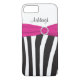 Personalised modern pink, black, and white zebra stripes animal pattern Barely There™ iPhone 7 case with a PRINTED ribbon and crystal jewel brooch.