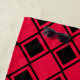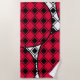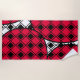 This beach towel has a mid-century modern design of solid black diamonds inside black diamond outlines with pink blobs under them, all on a field of white.