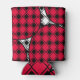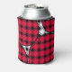 This can cooler has a mid-century modern design of solid black diamonds inside black diamond outlines with pink blobs under them, all on a field of white.