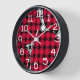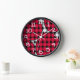 This wall clock has a mid-century modern design of solid black diamonds inside black diamond outlines with pink blobs under them, all on a field of white.