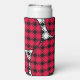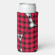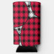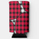 This seltzer can cooler has a mid-century modern design of solid black diamonds inside black diamond outlines with pink blobs under them, all on a field of white.